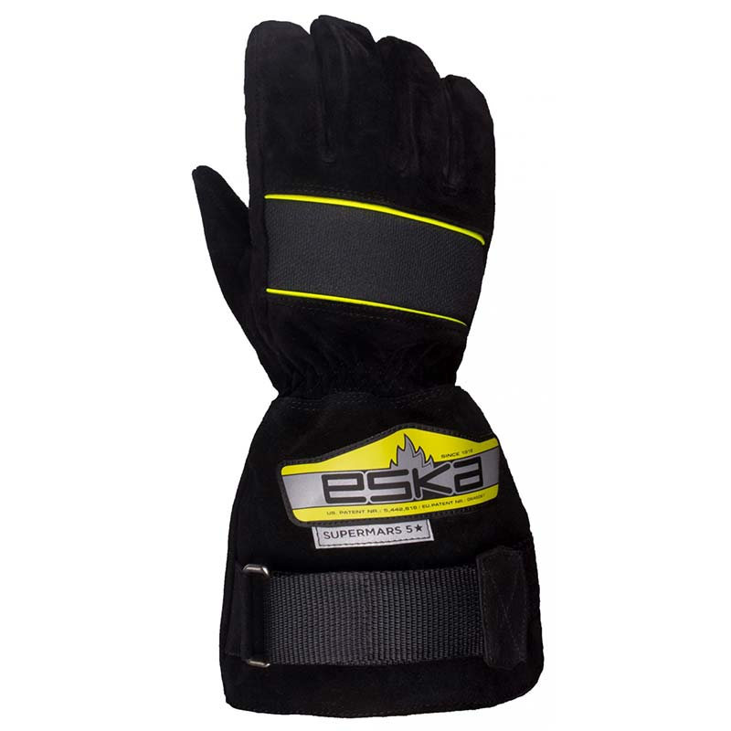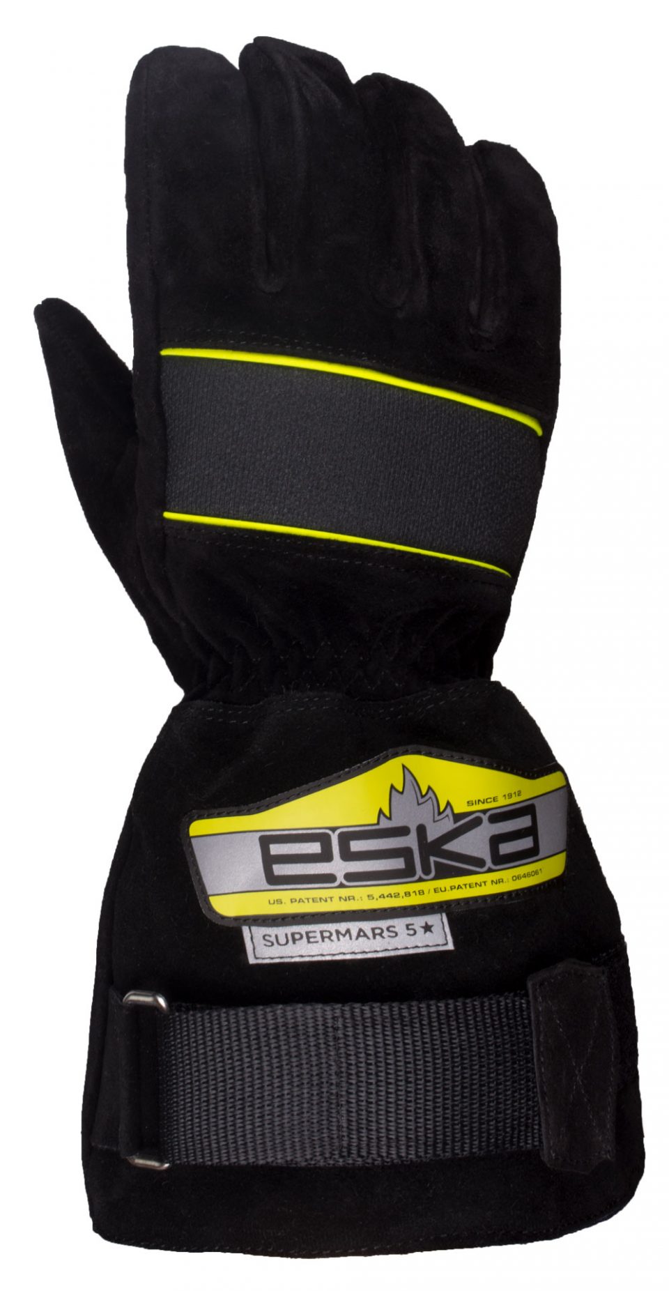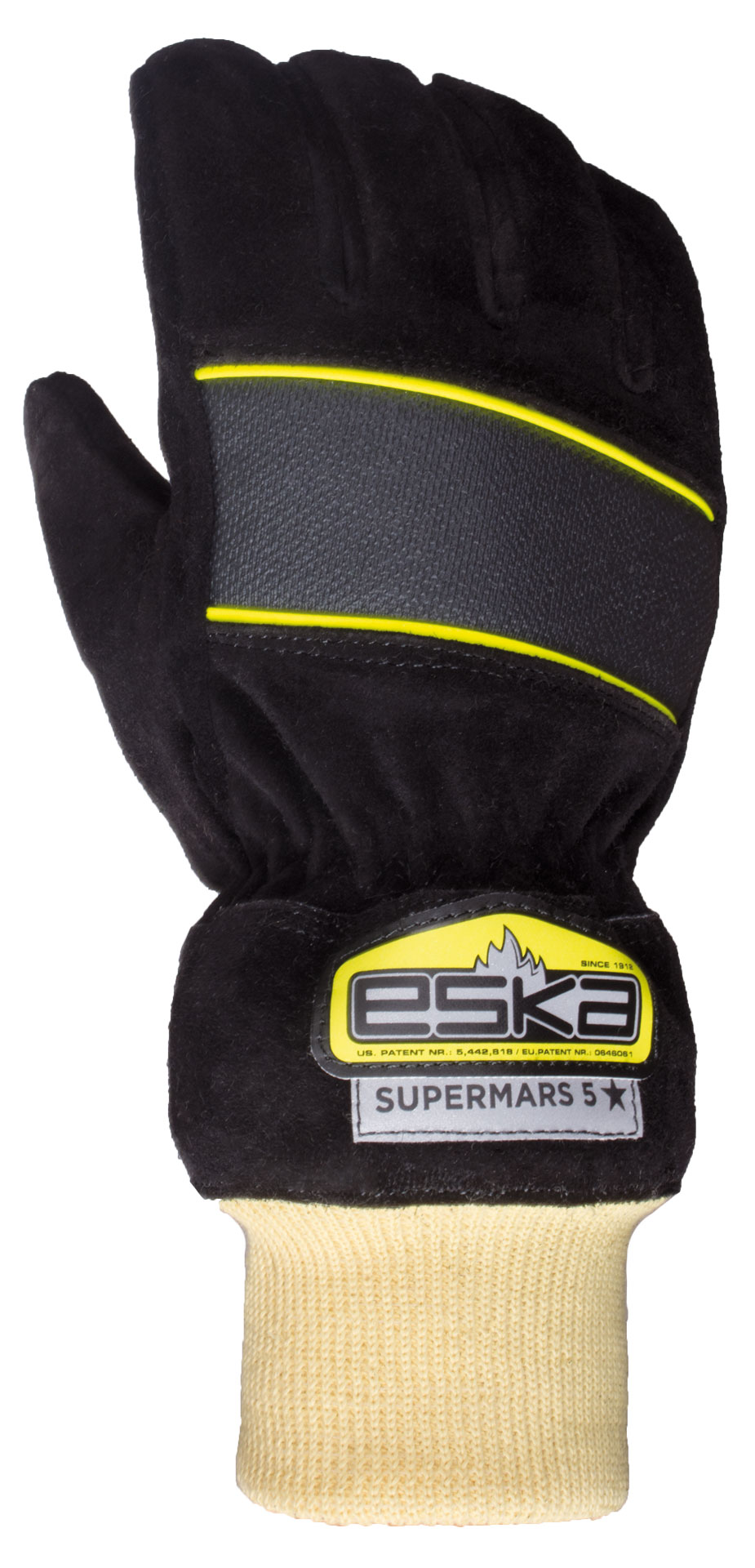 Super Mars 5 Guante de trabajo con membrana GORE-TEX® y cuero Fire Block que repele el agua, el aceite y los ácidos, así como no se contrae aun frente a las más altas temperaturas. Partes del área superior e inferior de la mano se encuentran reforzadas con Kevlar® recubierto con silicona y carbón. El novedoso forro anticortes de Kevlar® con acero y fibra de vidrio e hilos de plata garantiza a los operarios el más alto nivel de seguridad, incluso en situaciones extremas. La membrana GORE-TEX®, introducida según la patente de ESKA® desde las puntas de los dedos hasta el extremo inferior, es inseparable de la capa protectora del guante.
